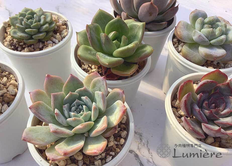 エケベリア・パキベリア・グラプトベリアなどの品種が6ポット(6品種)入ったセットです。